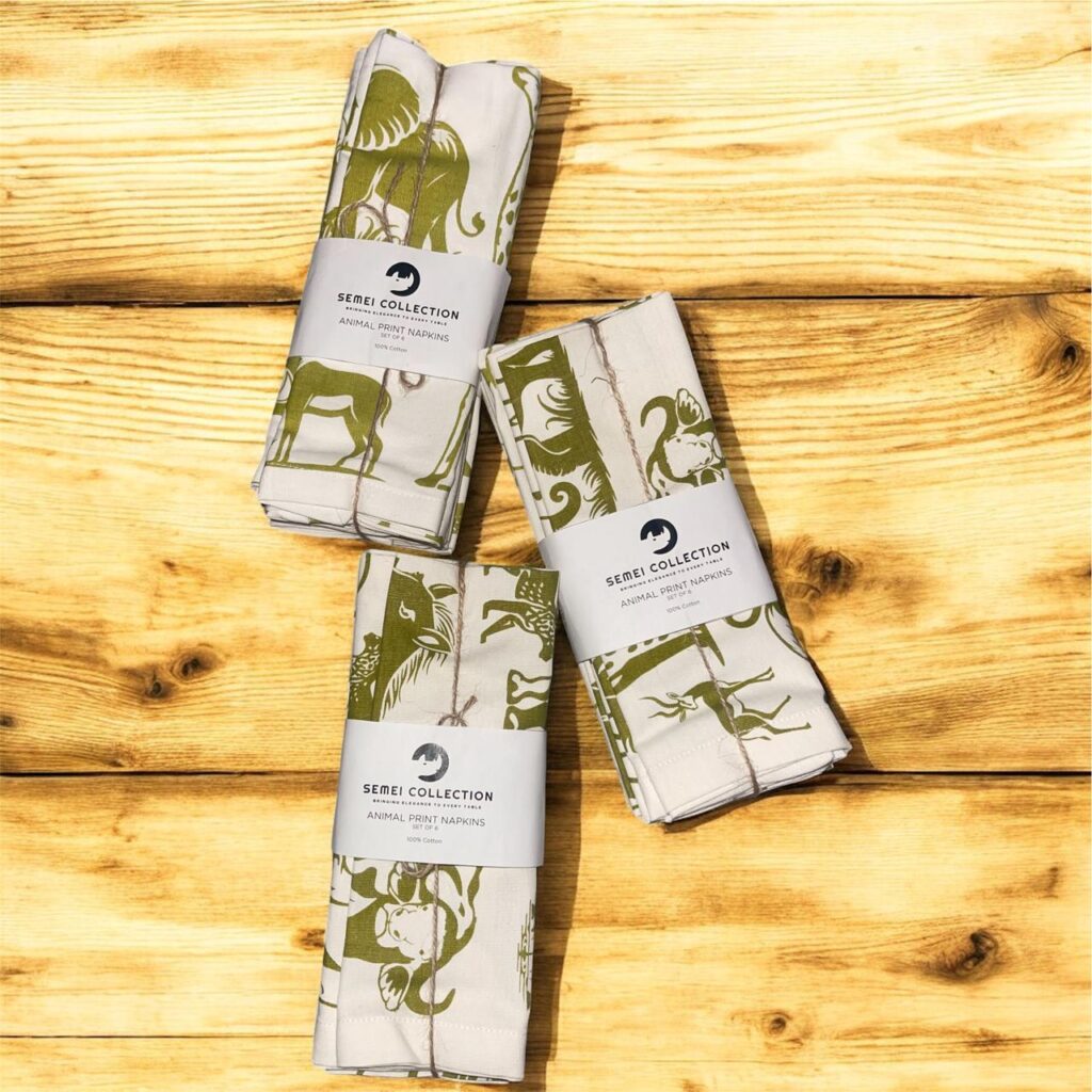 Safari Green, though beautiful, also carries a greater responsibility. The natural environments it celebrates are increasingly threatened. Habitat destruction, poaching, and climate change have placed countless species at risk. Yet, with each napkin we produce, we are reminded of the importance of our collective responsibility to preserve these ecosystems. At Semei, we’re not just about beautiful design; we’re about creating products that contribute to a meaningful cause. With every purchase of our Safari Green napkin, we hope to inspire action, whether it’s through supporting wildlife conservation efforts or simply starting a conversation about the natural world and its preservation.